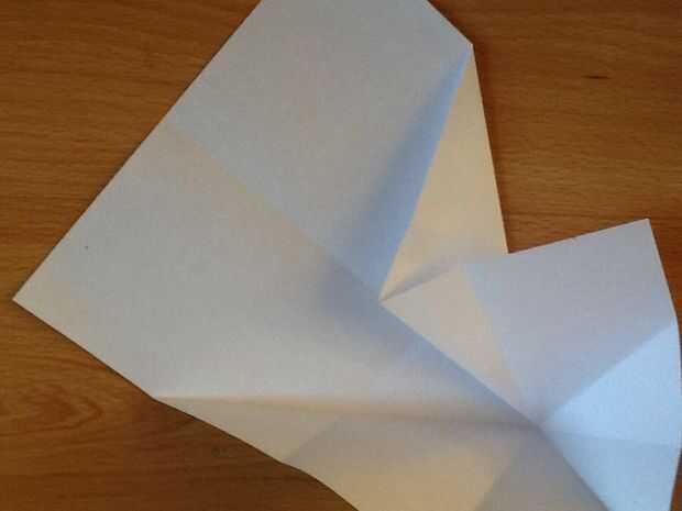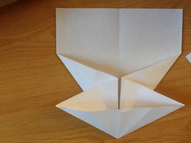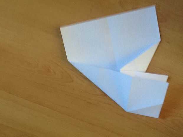 Doblar la esquina superior izquierda en el pliegue medio, a través de la doble cuarto/longitudinal. Entonces doble desde el pliegue del centro. Doblar la esquina superior derecha a donde ahora es la esquina superior izquierda. Doble que desde el pliegue del centro, haciendo un diamante en la nariz.
