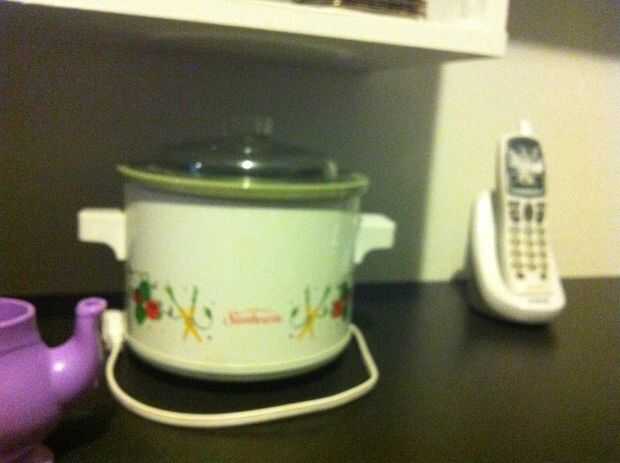 Compré una olla vieja y el teléfono inalámbrico en mi tienda local por $3. La olla tiene una tapa de plástico. Tenemos la intención de cortar el cable y sumergir el crudo final en cera para evitar que alguien de conectar esta cosa y "cocina" con él.