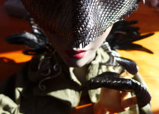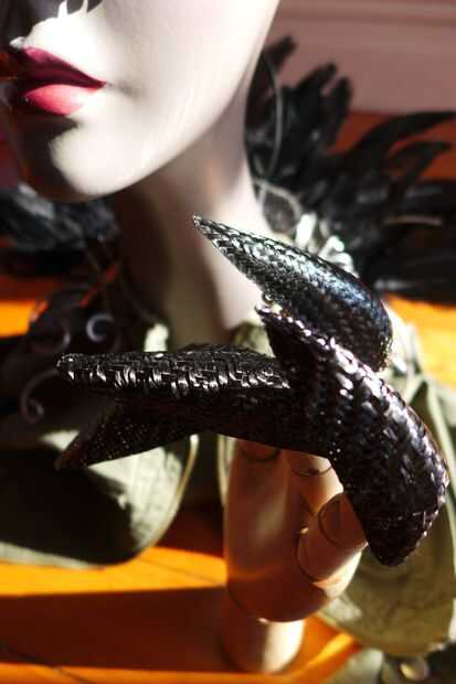 Cuidadosamente construido con fibra de carbono, plumas, cuero y elementos impresos en 3D, el conjunto une medios orgánicos y electrónicos en aterradora armonía.