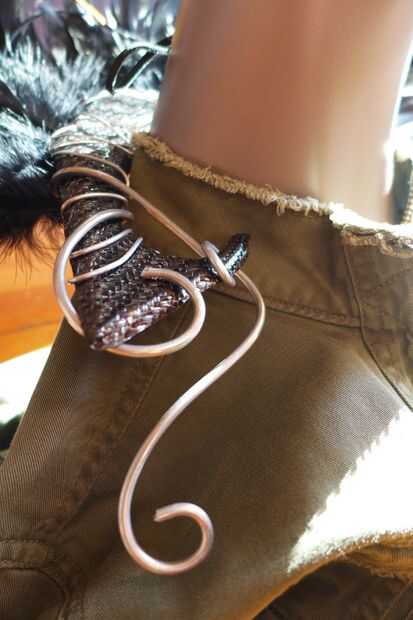 Las plumas orgánicas y zarcillos de alambre soportan la sensación tecnológica, biológica, quitinosa de la totalidad. Y las plumas tienen una iridiscencia de mancha de aceite que juega en esto perfectamente!