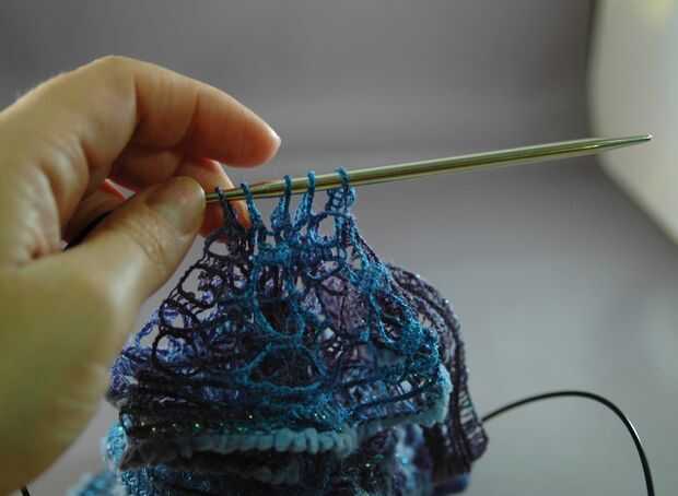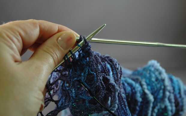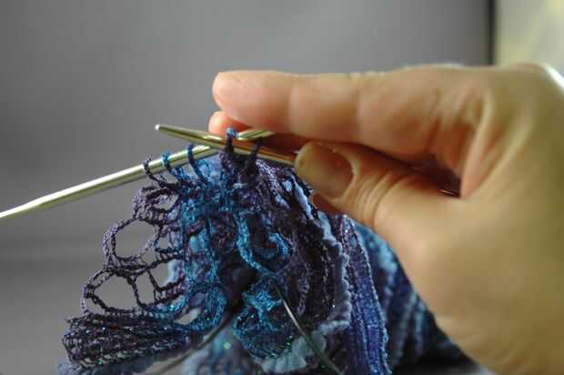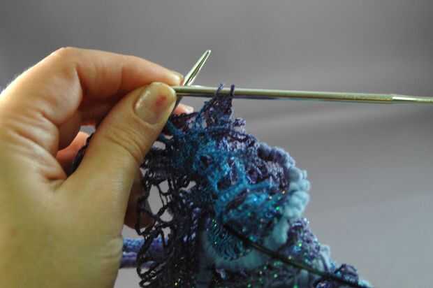 - Poner la aguja izquierda en el frente de la puntada en el lado derecho de la aguja derecha. Tire esa puntada encima y sobre de la puntada a la izquierda de la misma por lo que sale de la aguja. Se formará un bucle alrededor de la aguja y no venir deshecho (foto 6).
