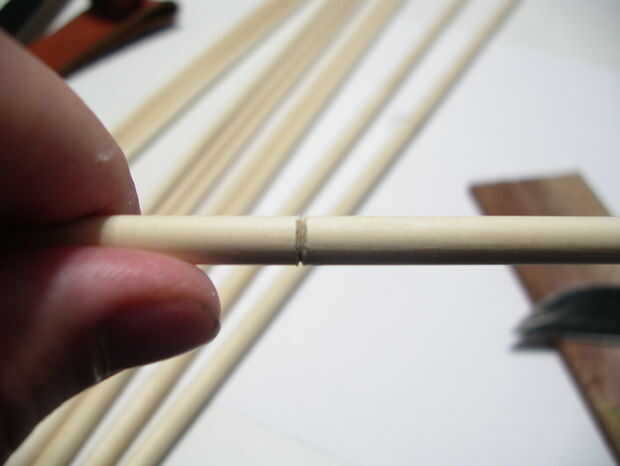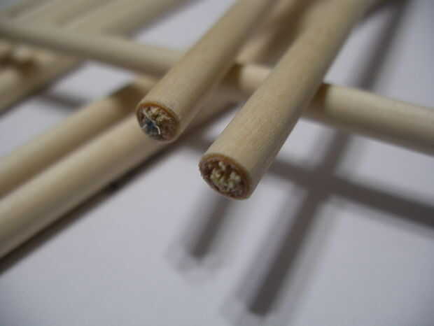 Empezar por cuatro palos de 1/4 de pulgada corte por la mitad. Una manera fácil de hacerlo sin una sierra es para marcar donde debe cortar, marcar profundamente con un cuchillo, entonces mantenga el palo con los pulgares cerca del corte y gire lentamente las muñecas. los extremos del palo deben hacer pequeños círculos mientras el freno de madera donde se anotó con el cuchillo.
