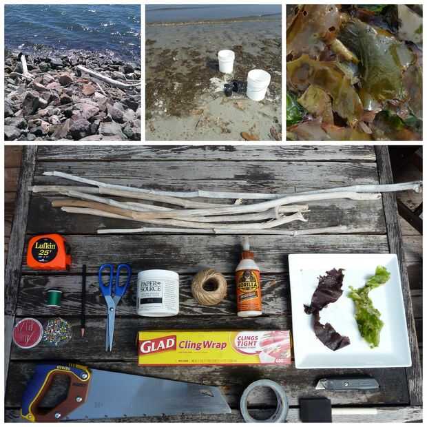 Había utilizado muchas fuentes porque tenía a mano en casa. Si usted quiere intentar este proyecto en la playa, todo lo que realmente se necesita es un cuchillo, una bola de hilo, hilo y aguja, una lona y pegamento si las algas no pegan lo suficientemente bien por sí mismo.