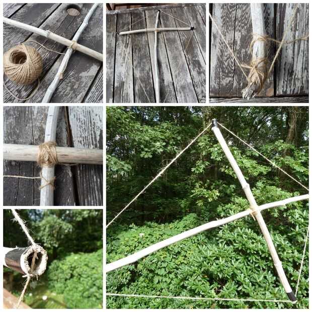 Tomar el hilo y se usa para unir las dos piezas. Comenzó con un ballestrinque y entonces procedí a envolver la cuerda y terminó otra vez con un ballestrinque. Encontré un gran video que proporciona una demostración sobre cómo hacerlo. Una vez que tengas tus dos palos atados, utilice la sierra para cortar ranuras en cada uno de los cuatro bordes de los palillos para la guita encajar en él. Atar una base para la cuerda en la parte inferior del marco y luego proceder a envolver la cuerda firmemente alrededor de cada uno de los bordes hasta que vuelvas a la parte inferior y termina el nudo. Ahora tienes un esqueleto básico de la cometa en el que se fije la vela.