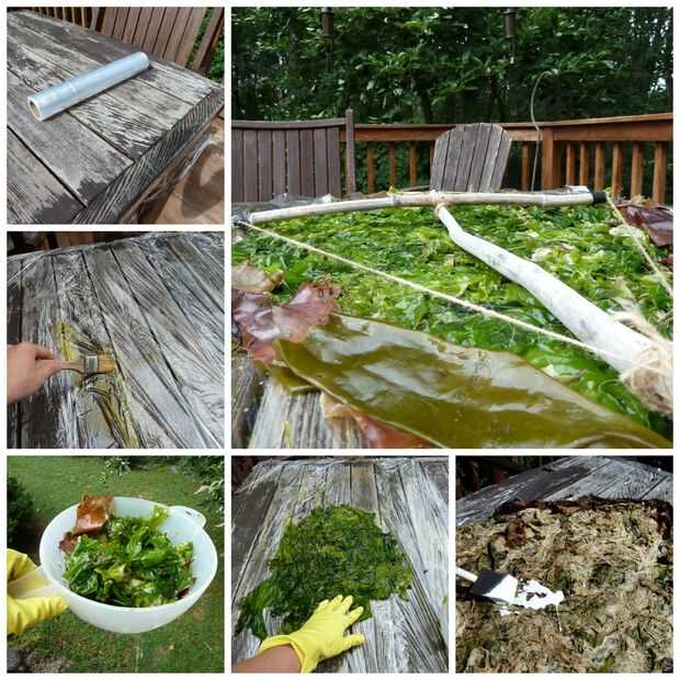 No se olvide de empezar por el plástico de envolver el espacio de trabajo y la aplicación de un lubricante (aceite de oliva barato) para asegurarse de que la vela no se adhieren a la superficie cuando deseca. Tomar las algas fuera de la cubeta del mar agua y colarlo. Asegúrese de que escurra el agua tanto las hojas como sea posible, pero tenga cuidado de no romperlos. Capa con cuidado cada hoja en el envoltorio plástico y poco a poco crear la forma de la cometa. Trate de seguir el diseño de capas que se muestra en el paso 1 lo mejor pueda. Utilice su propio criterio sobre cómo gruesa debe ser la capa; el deluente la capa el encendedor de la cometa será, pero sacrificar la durabilidad. Extender las vela dos o tres pulgadas más allá del esqueleto de la cometa para tener en cuenta la contracción cuando las hojas secas. Después se colocan todas las hojas, dejar secar. En el sol, no debe tomar más de dos o tres horas y si es muy caliente que tenga cuidado acerca de permitirles obtener demasiado crujiente. Desea las hojas que pegan como se secan pero no quiere se agrieta. Si las hojas no están bien pegadas en sus propios repartidos una capa delgada de pegamento la vela entera. Deje que el pegamento se seque durante veinte minutos o menos antes de colocar el marco.