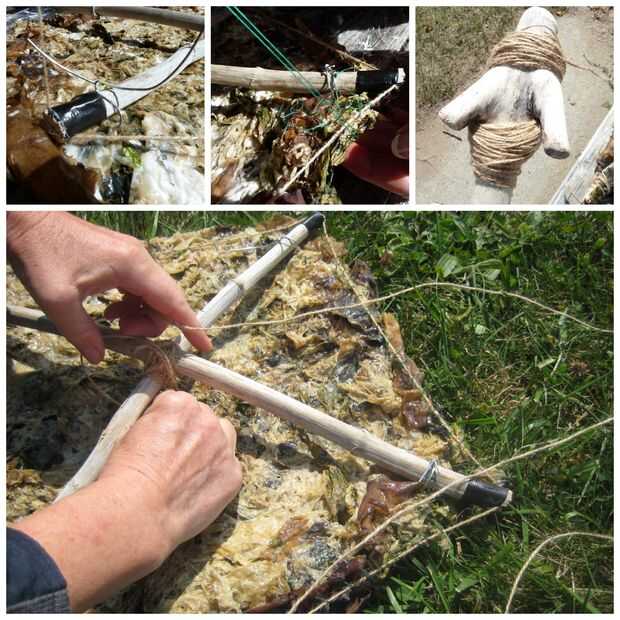 Cuando la vela esté lista, coloque el marco en el medio y asegurar los bordes externos con alambre de metal. A continuación, fije los bordes de la vela en el marco de la guita por coser cuidadosamente con un hilo verde. Cinta adhesiva o pegamento no funcionará bien aquí, la vela de algas es frágil y correosa y necesita un simple hilo que lo mantenga unido a la estructura. Se mueven lentamente y mantener pequeños espacios entre cada paso para construir la fuerza. Siga cosiendo alrededor de toda la trama.