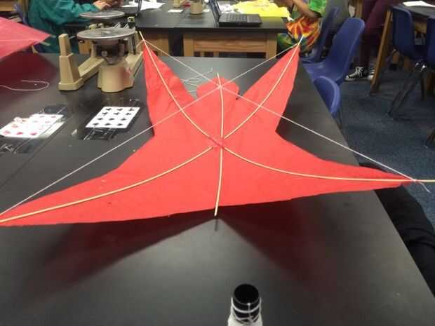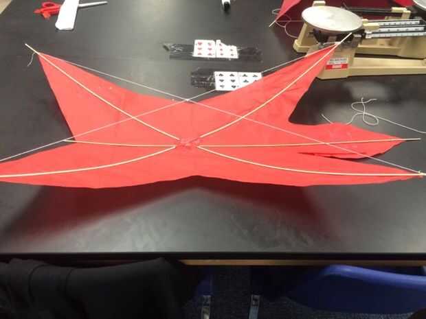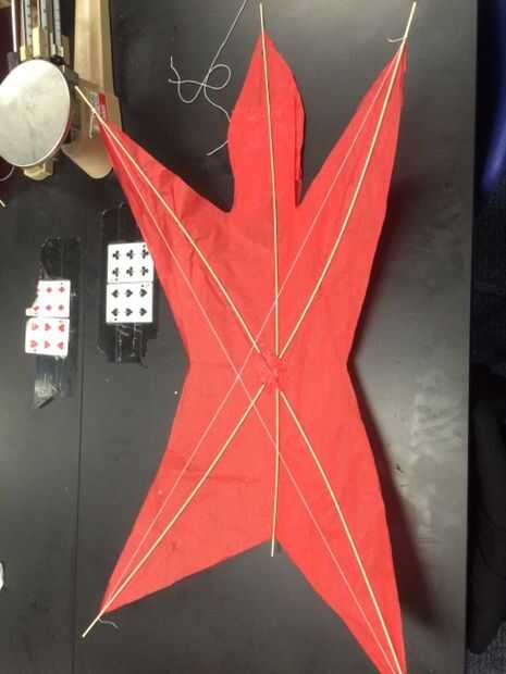 Después de que haya terminado con la adición de los largueros, necesitará añadir diedro a la cometa. Medir un trozo de cadena que es de una pierna a la pierna opuesta. Ate la cuerda en el mástil extra que está colgando de. Si no hay suficiente flexión a la cometa, parte de la cadena de bucle y poner el mástil extra a través del lazo.