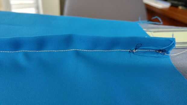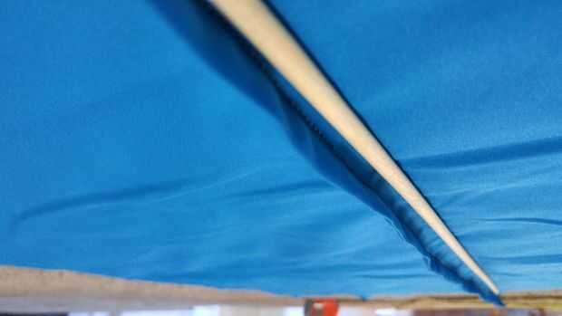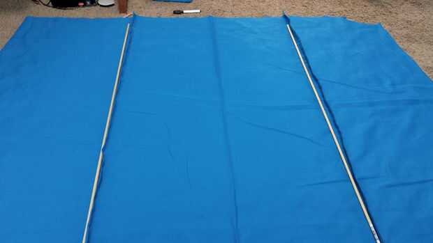 Luego cosí dos canales en la tela para los tacos. La mejor manera de determinar la ubicación es doblar el material de kite por la mitad y marcarlos en puntos iguales desde el centro de la tela. En este caso, la espiga es un pie de centro, que hace que sean dos pies aparte.