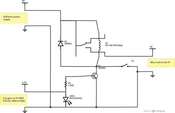 Ahora que me exaplain cómo funciona. Vamos a utilizar el pin TXD de frambuesa pi. Este pin va a 3,3 v cuando usted Acciona encendido frambuesa pi, por lo que será responsable de mantener el relé. Cuando apague la frambuesa pi desde dentro el sistema operativo, después ha cerrado completamente desde el lado del software, este pin va a 0v y por eso, el relé se desactiva. Así que todo está apagado. Su un diseño bastante bueno!