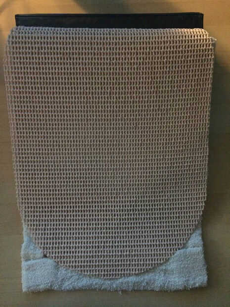 Una vez que se colocan las toallas y las carpetas, colocar el tapete antiadherente sobre la parte superior de las carpetas. Debido a cómo se sientan, debería ser un plano liso. Mantener el estera color en todos los bordes en las tapas de las carpetas si se puede. El mat será probablemente más de las carpetas, puede meter el extra en la parte superior de la carpeta si es el caso. Puedes también recortar los bordes si quieres, aunque no se molestó.