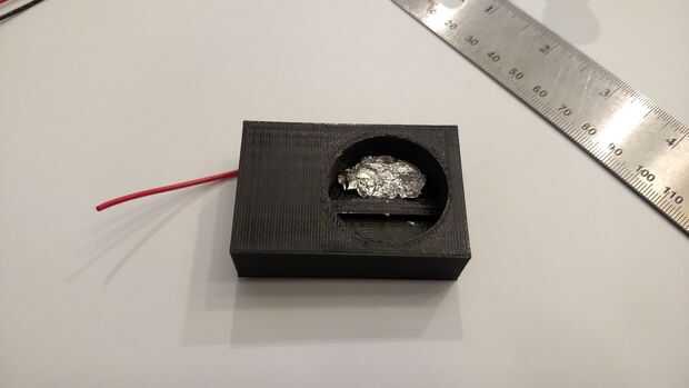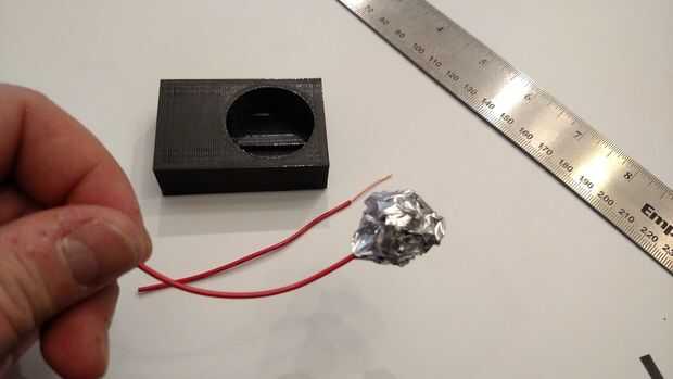 Rasgar un pedazo pequeño de papel de aluminio (utilicé una pieza que fue de aproximadamente 100 mm x 60 mm, pero esto no necesita ser exactos) y la bola para arriba libremente en el extremo pelado del cable. Pase el cable a través de la abertura en la parte inferior del soporte y presiona la hoja en la parte inferior del agujero.