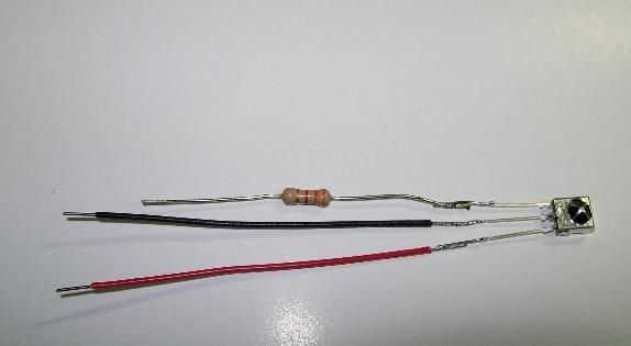 Resistencia Grab el k de 3,3, 38kHz módulo infrarrojo y un par corto piezas (longitud de la resistencia) de alambre y crearan el simple circuito como se ve en la primera fotografía. Es importante que el IR está conectado correctamente, así la soldadura lo juntos hacia arriba para que coincida con la fotografía.