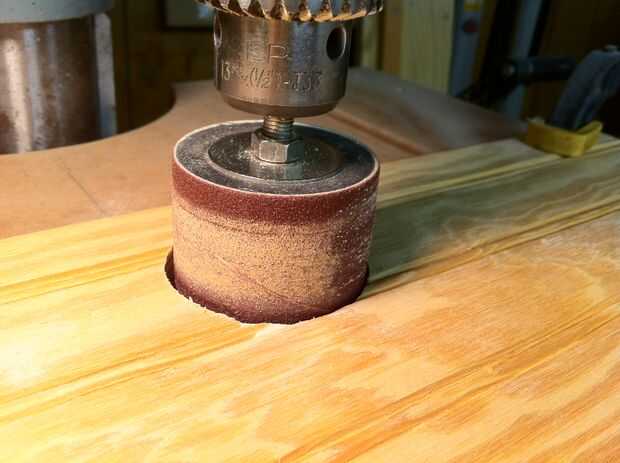 El primer paso es crear una plantilla de asiento curvado.  He descargado una copia impresa en PDF de este asiento curvado en http://ia700209.us.archive.org/9/items/RibSeat/Rib.PDF.  He incluido una copia del PDF abajo.  El contorno del asiento imprime en cuatro hojas de papel y puede entonces grabado juntos en su madera.  Utilicé un trozo de madera contrachapada de 1/4" para hacer la plantilla.  Transferir el contorno de la madera y recortar en su sierra de cinta o con una sierra de calar.  Hacer el corte un poco más grande que el contorno y la arena a la línea mediante un tambor de lijar en una prensa del taladro (Foto 2 y 3).