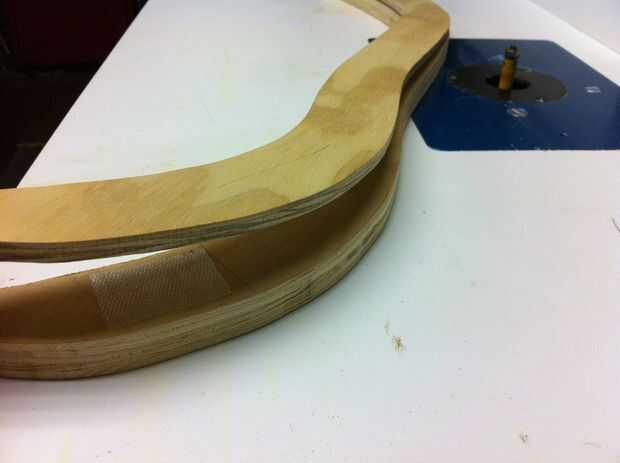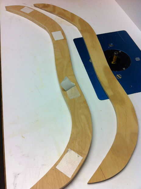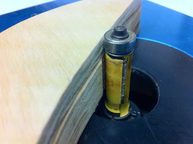 Para utilizar la plantilla para hacer una copia exacta del asiento curvado, necesitarás una escalera broca de fresadora. Porque estas piezas son estrechas, lo mejor es usar una mesa de fresadora, sin embargo, también puede ser logrado con un router de mano. Tome la plantilla y dibuja el contorno sobre un trozo de madera. En este caso, estoy utilizando contrachapado de abedul de 3/4". Corte la forma con una sierra de cinta o de vaivén alrededor de 1/16-1/8" fuera de la línea. El resultado final es una pieza áspera cortada ligeramente más grande que la plantilla que se recortará suave utilizando un router. Cinta doble cara moqueta es suficiente para mantener las dos piezas de madera para cortar.