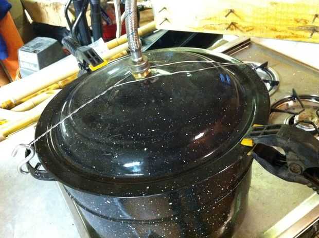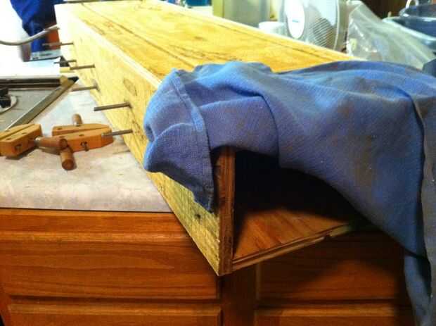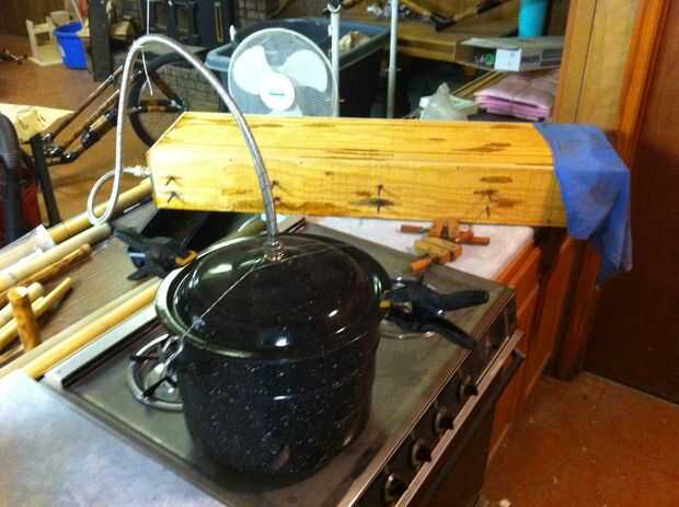 Con todo montado, agua se lleva a ebullición y vapor se permite acumular en la caja. Cuando el vapor está rodando fuera de la caja, 2 piezas de madera contrachapada de 1/8" se colocan dentro de la caja y el extremo cubierto con una toalla. La madera contrachapada permanece en el vapor por una hora. Mi experiencia fue más de una hora causada las capas de madera contrachapada separar y hora fue el tiempo suficiente para obtener buena flexibilidad.