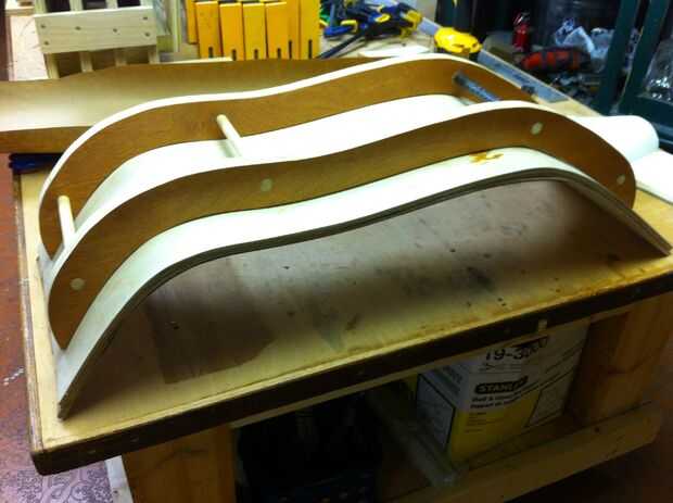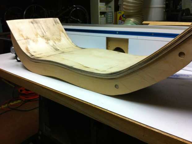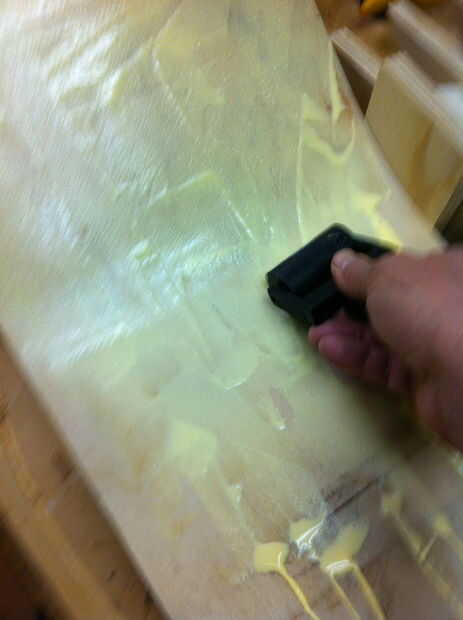 Después de permitir que la madera se seque en la prensa durante 24 horas, es el momento de pegarlos en un solo bloque. Nada extravagante sólo Unte el pegamento, apilar las piezas y ponerlas en la prensa para secar por 24 horas. Curiosamente, tomó todas las cuatro piezas para realmente sostener la forma del asiento. 2 o 3 piezas no es suficiente para evitar el asiento muevan cuando quita de la prensa, pero 4 piezas parece ser la cantidad necesaria para mantener la forma. Asegúrese de que usted deje que el pegamento de madera se seque 24 horas completas antes de aflojar ya que hay mucha energía cinética en la madera.