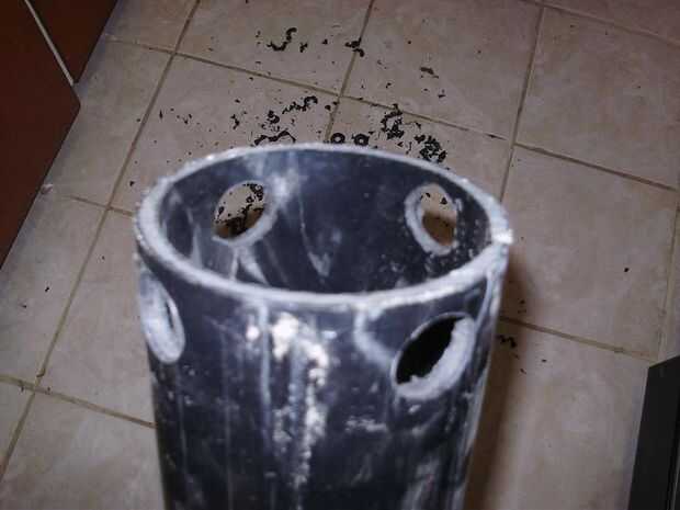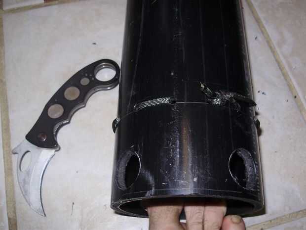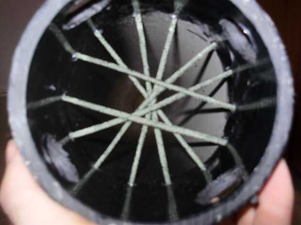 Después necesitaba un lugar para dejar que el agua, por lo que 4 más 1' los orificios perforados alrededor de la base del tubo. Siguientes que pasé a 3/16" poco y perforaron un anillo de agujeros alrededor de la base de 4" para arriba. Roscado el paracord a través de estos orificios que actúan como una barrera para evitar las lavadores caiga fuera de la base.
