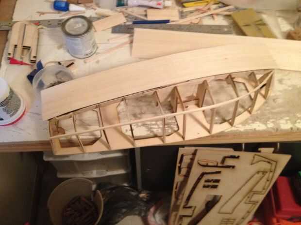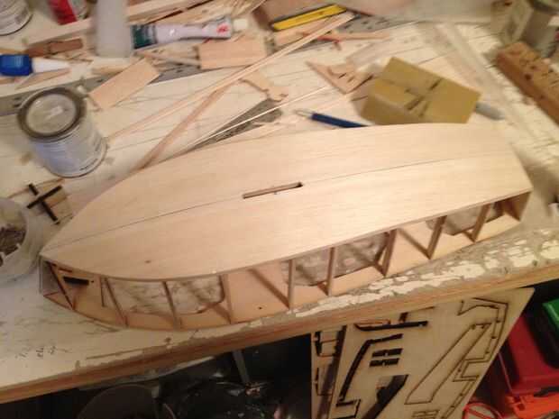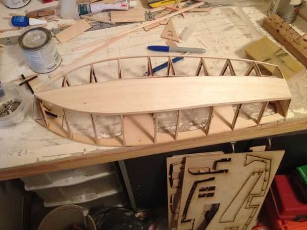 pongo láminas en la superficie inferior del casco. Usé 1 / / 16" Balsa. He utilizado 3 pulgadas ancho hoja para esto. Primero pegué la madera hacia abajo de la línea central del barco. Entonces la vuelta se CA encima y aplicada a los mamparos y los largueros en el borde, uno de los 2 mamparos a la vez. No hay tanta curvatura en la parte inferior del casco por lo que va muy fácilmente. Después de pegar la hoja sobre había ajustado alrededor del borde con un cuchillo del exacto y luego lijar el resto del extra a. La he repetido para el otro lado. Para el lado 2, puede que necesite recortar un poco desde el borde de la línea central para conseguir que se ajuste contra el lado que ya tiene en. Repita el pegado, recorte y proceso de lijado. Después de esto, recorte el exceso alrededor del orificio de la quilla también. Sólo utiliza un cuchillo del exacto y corte contra la madera contrachapada para una guía.