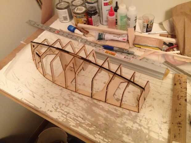 Ahora se pueden montar todas las piezas para el casco en posición. Todas las partes tenían que se enclavija ranuras en ellos. Todo reunido en una superficie plana y presione todos los mamparos en la cubierta. Obtenga todo lo alineado lo mejor posible.