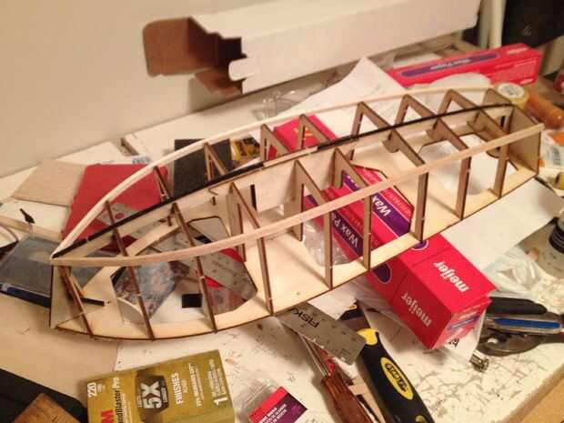 a continuación, agregue 2 largueros de balsa abajo las esquinas de los mamparos. Estos están hechos de palo de balsa de 1/8 "x 1/4". Son sólo con el fin de dar la chapa para los lados y la parte inferior algo para pegar a. El ajuste no es terriblemente importante. Usted necesitará a remojo en agua durante un tiempo ablandar hasta el punto que se curva alrededor del frente. La forma más fácil de pegar estos es comenzar en la parte trasera, pegue el travesaño y el mamparo trasero y asegúrate que están y trabajan su camino a seguir. Al llegar a la parte delantera, puede mirar hacia abajo y recortar el frente a la longitud correcta para llegar a caber en la muesca en el primer ex.