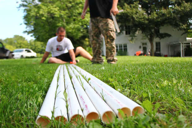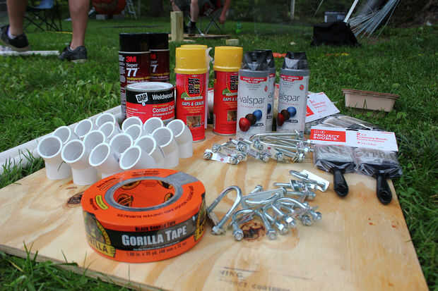 20 pies enorme arácnido con suspensión víctima envuelta en su web! Pasé aproximadamente $40 utilizando gran parte de las fuentes de alrededor de mi casa.Materiales necesarios:secciones de 8 pies de 1/2 pulgadas pvc x 10grado 45 x 1890 grados x 8X 8 d