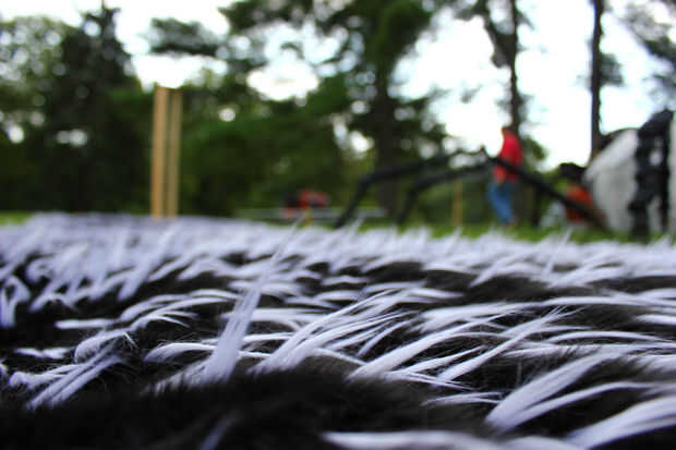esto es Hellga, la araña gigante. ella se crea conmalla de alambre, sobre 2 rollos de 24" loalambre, para unir leperiódicocinta para ductosharina (papel maché)pintura en aerosol negrouna bolsa de material de la web de araña negraalgún tipo de pegame