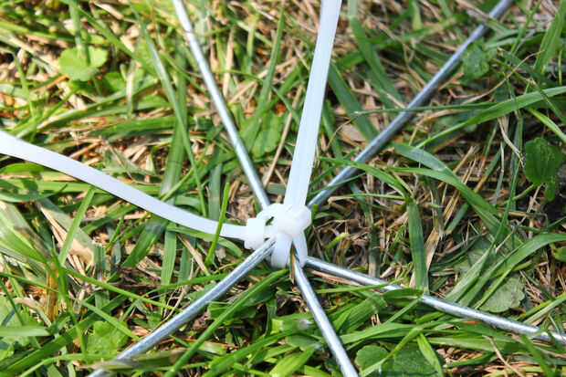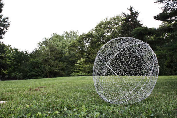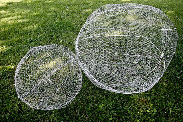Luego envuelven los globos con 1" alambre de pollo. Creo que es mejor trabajar en secciones de 2 pies. Corte las secciones usando las tijeras de acero. Guantes son opcionales, pero estar preparados para algunos cortes de dedo si eres como yo :) Cuando empiezas a envolver estos globos usted encontrará difícil obtener una envoltura limpia ya que el alambre de pollo plano no actúa igual cuando se coloca sobre una superficie de 3 mundo dimensional. Quisiera cortar secciones pequeñas y luego conecte los extremos del alambre con los extremos abiertos del alambre sí mismo y en otras ocasiones, zip lazos. Usted encontrará su camino a través de este proceso, posiblemente sangrado y frustrado pero que es alambre de pollo:) \
