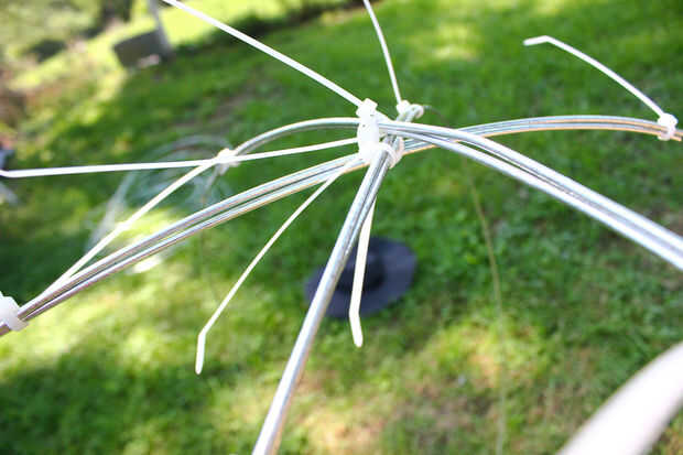 Una vez tengo bajo control, había comprometido por los extremos y atados juntos con 2 abrazaderas de plástico. Corbata estrecha. Hice 3 más de estas formas circulares, todo de tal manera como para crear el mundo. Les até todos juntos utilizando más ataduras de cremallera. Entonces hice un travesaño (el Ecuador) para darle más estabilidad.