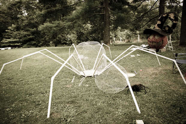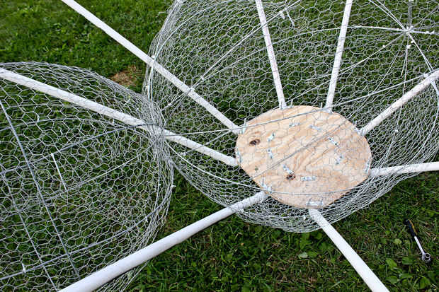 Originalmente hicimos esto con piezas de metal ranurados acero plano que creo que se utilizan para colgar conductos. Más tarde se actualizaron por quitar las piezas de metal planas e insertar la varilla roscada a través de la base y luego fijándolo con fender arandelas y tuercas. Atamos el alambre de pollo cuerpo con ataduras de cremallera.