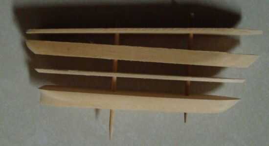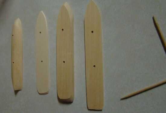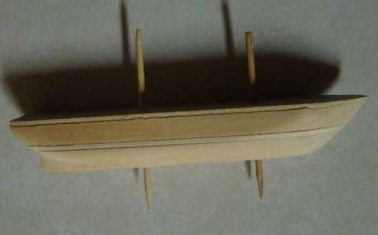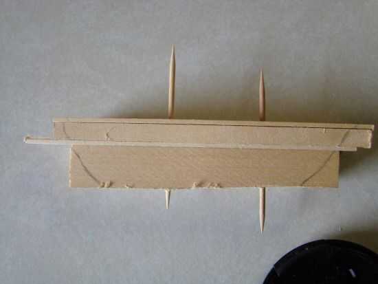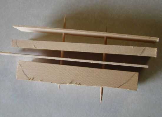 Los agujeros se perforan a través de la madera que se forma las partes superiores e inferiores del casco. Palillos de dientes entonces se insertan en los orificios para mantener la madera correctamente alineada durante el resto de la construcción. Dibujar un contorno áspero en los trozos de madera apilados.