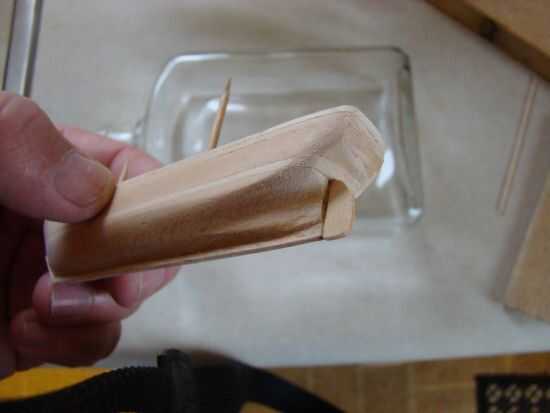 a continuación, se agregan la quilla y el timón a la parte inferior del casco. Usted puede comprar realmente delgadas piezas de madera en tiendas de artesanía. Esto le ahorra mucho tiempo. Una pieza de 1/16 X 1/16 tira fue utilizado para la quilla. También fue utilizado para el carril en la parte superior de la cubierta.