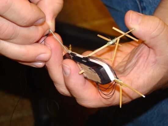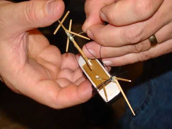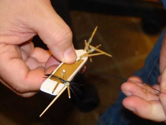 Un trozo largo de hilo pasa a través de los cinco agujeros en el casco y el mástil formando las cubiertas.
