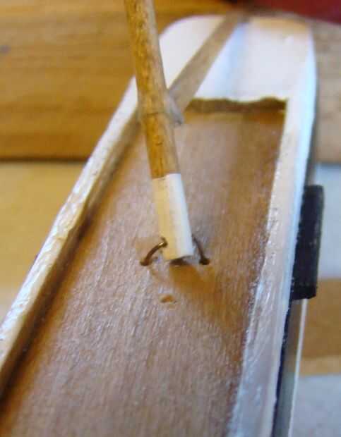 La bisagra de alambre en la parte inferior del mástil entra dos agujeros en el casco. Es trenzado por debajo, y el exceso se recorta distancia.