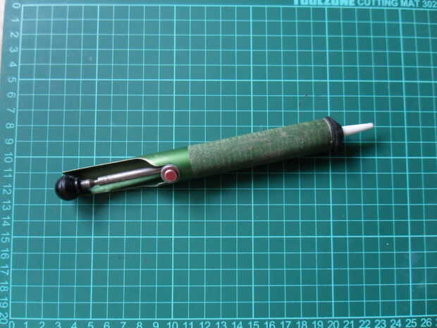 El lechón de la soldadura es restaurable, un tiro bomba de vacío con una punta de teflón. Para usar, ponga el soldador en la articulación para reflujo. Una vez que el estaño se haya fundido, ofrecemos la punta de la articulación de la bomba y presione el botón de disparo. La bomba se activa y chupa la soldadura de la articulación.