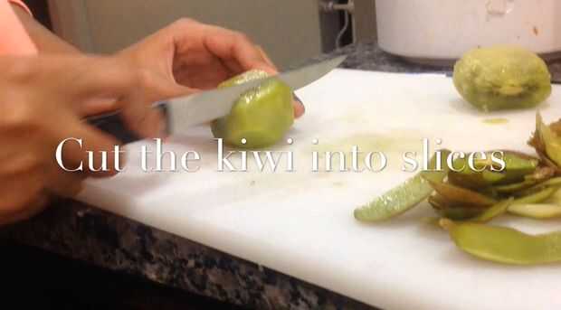 Mientras está horneando las galletas, o mientras esperas que se enfríe, sacar la fruta. Puede utilizar frutas lo que quieras, pero utilicé fresas, kiwi y arándanos. Cortar las fresas en mitades o cuartos, y luego pelar el kiwi y cortar demasiado.