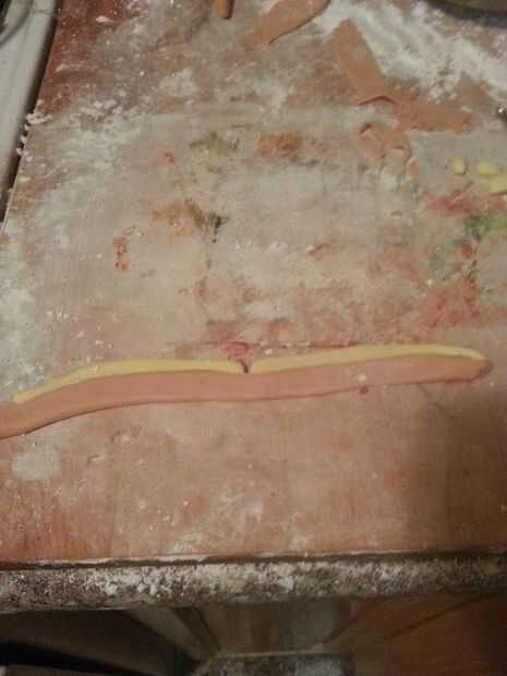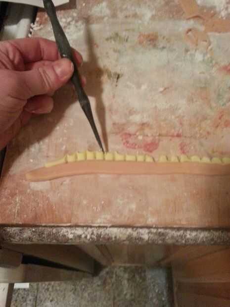 Lo unico esculpido antes de poner en la cabeza fueron los dientes. Me di cuenta de una manera decente de hacer color de rosa y amarillo en cintas de 1/4", utilizando agua para pegarlos juntos, y luego cortar los dientes de la blanca. Luego, utilizando una tercera pieza de pastillaje (fondant), creó la goma usando una tapa de pluma hacer semicírculos en el borde donde Mostrar la parte inferior de los dientes. Trabajó muy bien y me impidió tener que esculpir cada diente individualmente.