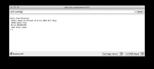 Así, en primer lugar que tuve que escribir la función y llegar a mi mesa. Un Scout configurado tiene un bosquejo de lo que le permite controlar por introducir código en el monitor serial. (Esto significa que se puede programar sobre la marcha, sin necesidad de volver a compilar y cargar el código con cada cambio!) He conectado mi Scout plomo (Buckaroo) y encendió el monitor mediante el IDE de Pinoccio, una versión ligeramente modificada de la IDE de Arduino.