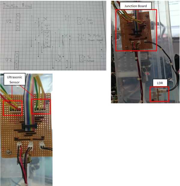 Conecte el circuito de la Junta de Unión en el diagrama esquemático en la Junta de tira. U1 y U2 están conectadas a los sensores ultrasónicos.