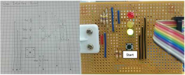 Conecte el circuito de la tarjeta de interfaz de usuario en el esquema en la placa de la tira. La tarjeta de interfaz de usuario debería ser como la siguiente después de la implementación: