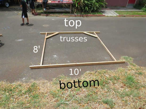 4. utilizar para atar, crear un triángulo rectángulo de 45 º con el 2' segmentos. Asegúrese de que ambas armaduras están conectadas en las dos esquinas superiores del cuadrado. Tornillo de las cerchas en los marcos.