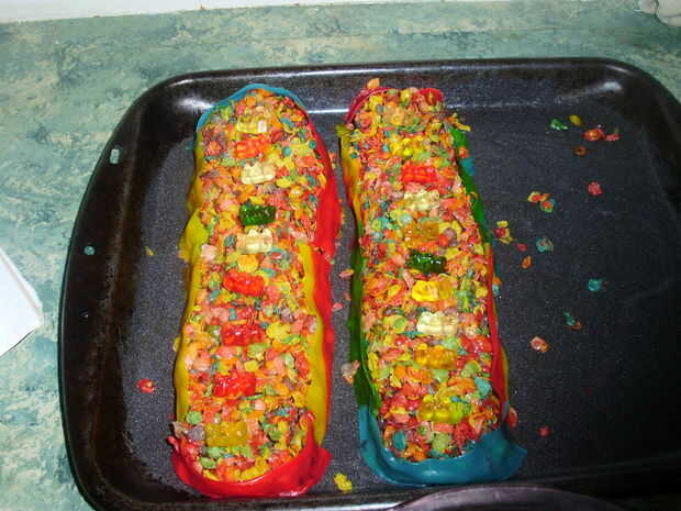 Ahora aproximadamente la mitad de la mezcla y dividirlo en tres secciones. Tomar una sección y aplanar en un rectángulo de largo. Pone gusanos gomosos a lo largo del rectángulo. Con cuidado enrollar el rectángulo alrededor de los gusanos para crear un tubo.
