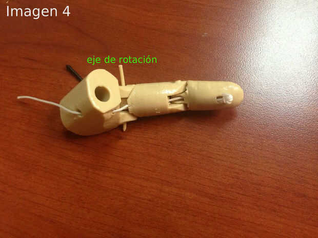 - Fijar el Pulgar con la Pieza ThumbPalmUnion.STL Calima filamento para formar el eje de rotación. Imagen 4