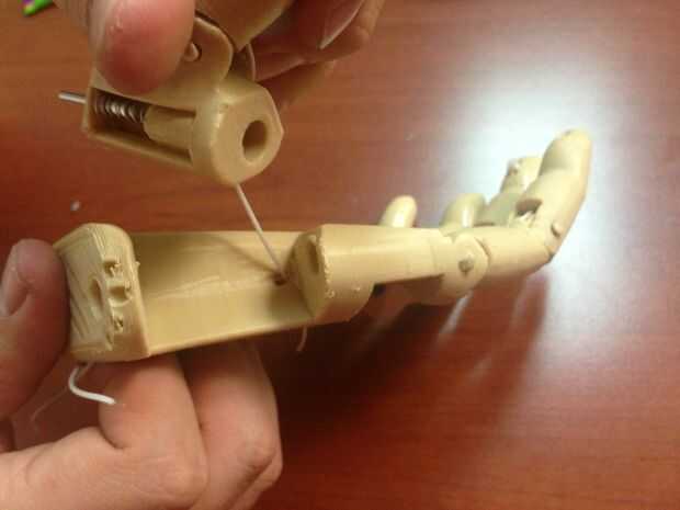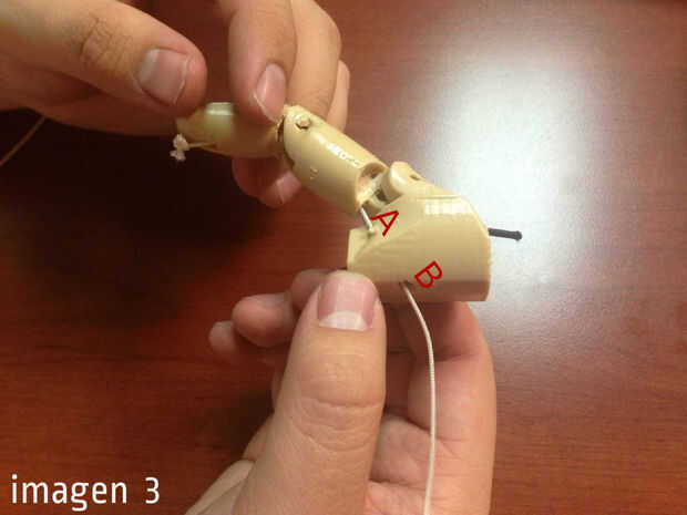 - Montaje el cordón de Nylon de manera atraviese la pieza ThumbPalmUnion.STL pasando por el montaje A y B hasta llegar a la palma. imagen 3