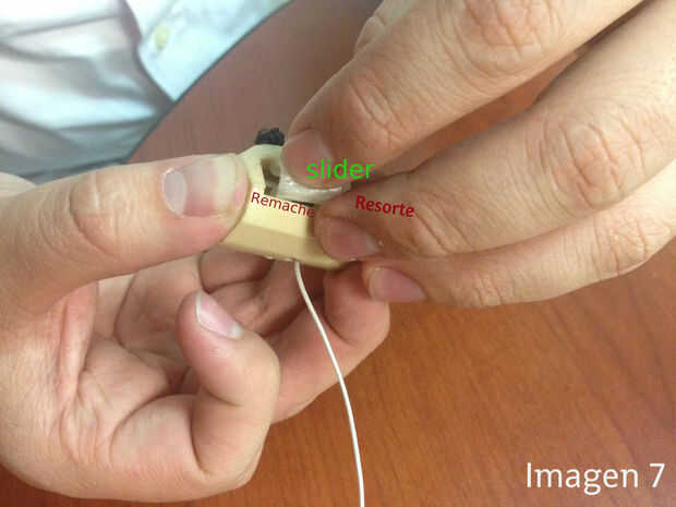 - Colocar la cabeza del remache dentro del resorte hasta comprimirlo de tal manera el remache pueda entrar en el conducto en su totalidad. La de como se muestra en. Imagen 8