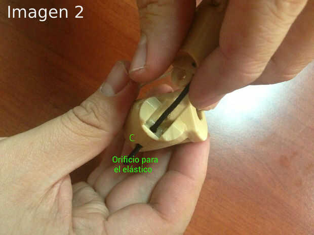 - Montaje el cordón elástico de manera atraviese la pieza ThumbPalmUnion.STL pasando por el orificio C. Al atravesar el orificio. imagen 2