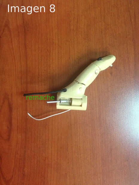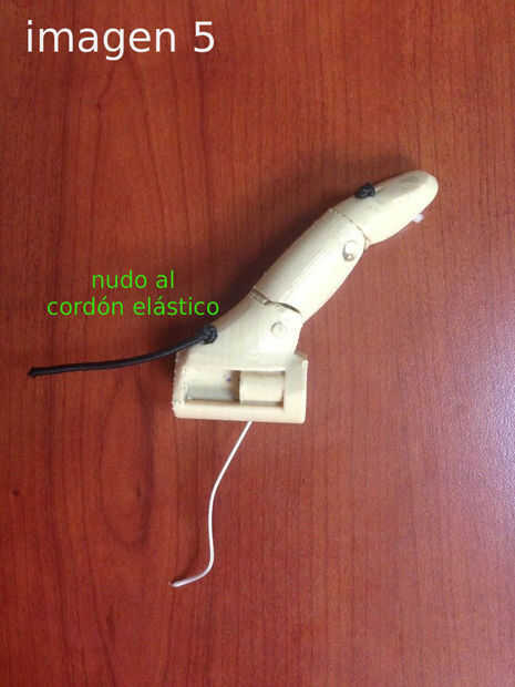 - Montaje el cordón elástico para la extensión y cordón de Nylon para la flexión desde la falange distal a la proximal. El cordón de Nylon debe medir la longitud del dedo + 6 cms. Imagen 1