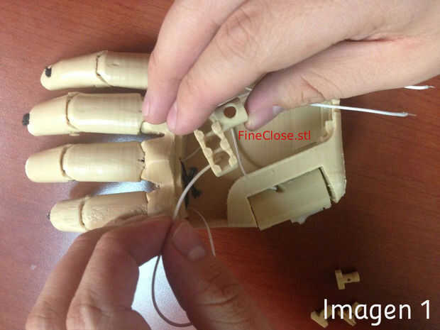 Para flexionar los dedos es necesario tensar los hilos de nylon. Se pueden jalar los 5 dedos al mismo tiempo para la mano cierre completamente la pieza FineClose.STL une los hilos de los dedos para al tirar del cable de freno de bicicleta los cinco dedos puedan ser flexionados y habilitar cerrar los dedos el tiempo se desee cerrar los dedos de la prótesis