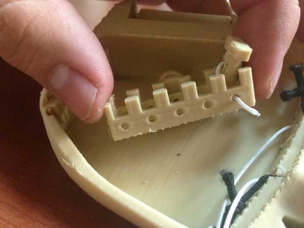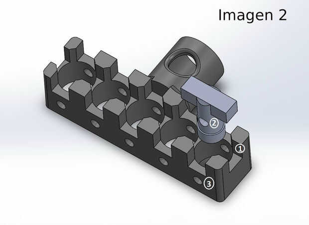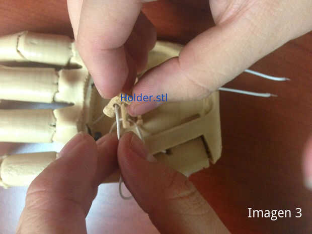 1. en la Imagen 1 se muestra la pieza FineClose.STL, aquí hay atravesar los hilos de nylon de los dedos desde el Agujero 3 pasando por el agujero de la pieza Holder.STL 2 y terminando en el agujero de 1, como se muestra en la imagen 2 al finar realizar un nudo para sujetar el hilo.