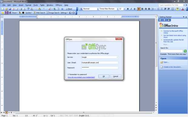 Ahora que OffiSync está instalado nos podemos configurarlo para trabajar con Google Docs.  Primero tenemos que abrir Microsoft Word.  Cuando Word abre verá una nueva barra de herramientas, si no, haga clic derecho en la barra de herramientas y seleccione OffiSync en el menú desplegable.  En la barra de herramientas OffiSync vamos a guardar, haga clic en icono, que le pedirá que acepte el CLUF.  Después de haber aceptado, ingrese su información de cuenta de Google y haga clic en "Aceptar"