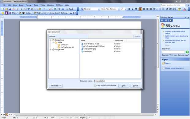 Cuando ha ingresado su información usted será llevada al ahorro diálogo donde especificamos un nombre de archivo y donde queremos guardar el archivo.  Usted puede presentarse con un mensaje que indica que no tienen los sitios de Google, ignorar esto como nos estamos centrando en Google docs ahora.  Ampliar el menú de Google Docs y seleccione la carpeta de destino (se pueden añadir carpetas en Google Docs).  A continuación escriba su nombre de archivo y haga clic en guardar.  Nota: No seleccione "Guardar como formato de archivo de oficina" ya que el archivo no es editable en Docs de Google